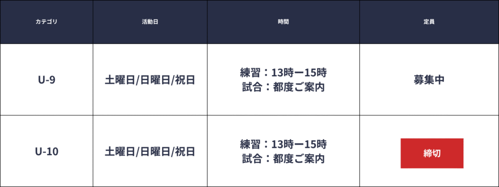 - 総合的に判断し、入団の可否を1〜2週間以内にご連絡いたします。合格後に入団手続きやユニフォームのご案内を行います。